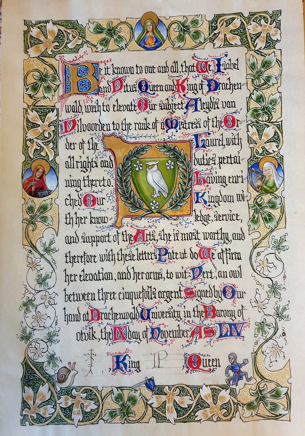 The scroll was made by a very dear friend who lives in New York and doesn't play in the SCA anymore, so I managed to produce an interestign mix of tears and laughter when I heard his name.