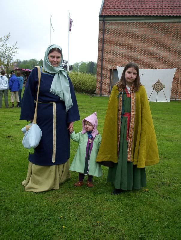 Here's a picture of me, Maja and Valeria from yesterday's medieval market. It was raining most of hte time. Maja's wearing tights, viking age shoes, a linen shift, a thin green wool tunic (the same as on this picture from last year, but with side gores and new, wider and longer, sleeves added), her new viking coat and a linen cap.