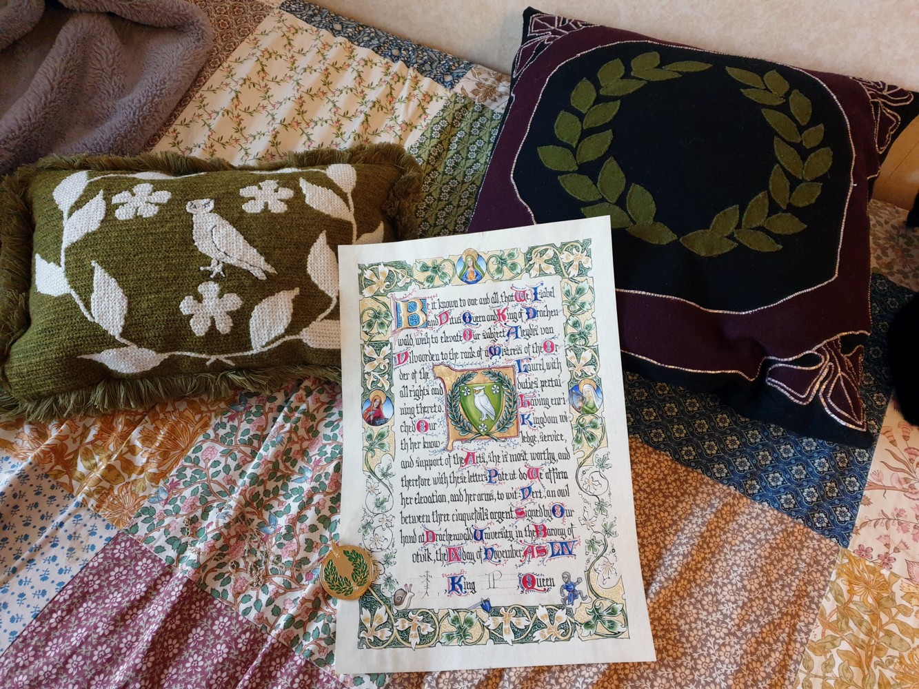 I was suspecting it when hubby packed the 50 years gift champagne that I got from some of my co-workers, but of course I wasn't sure. So instead of sitting at the registration all Friday evening with my friend Alfhild I spent it in vigil, contemplating becoming a member of the Order of the Laurel (SCA stuff). And, as you can see from the images of my scroll, medallion and the pillows that were gifts from my Laurel mother/mistress Helwig and my Laurel sister Lia, I accepted this honour.
